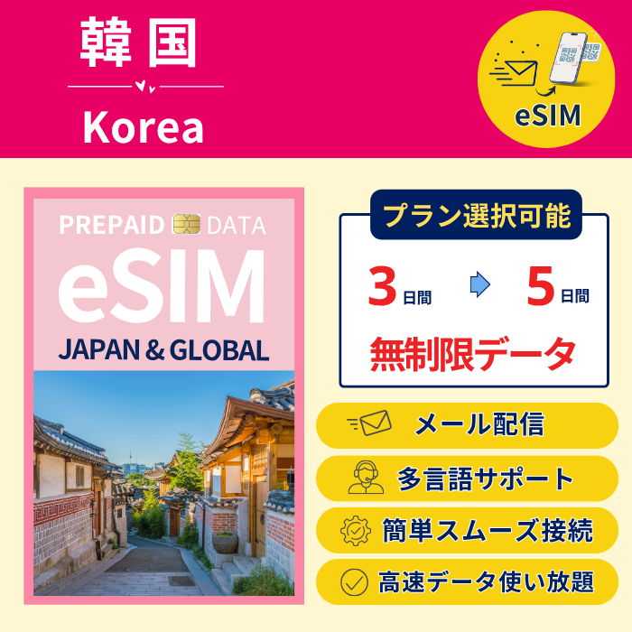 韓国 eSIM 無制限 高速データ使い放題 最短即日メール配信 日本語サポート 利用期限なし 実店舗販売 プリペイド 2点以上で5%OFF