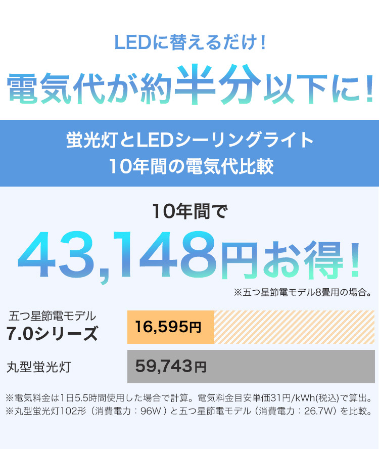 10年間で約43148円お得。※五つ星節電モデル8畳用の場合。