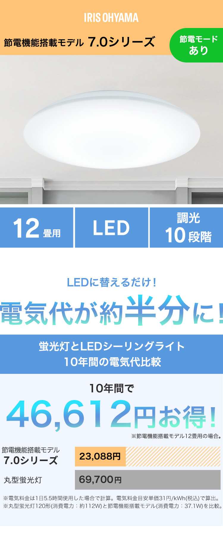 蛍光灯とLEDシーリングライト10年間の電気代比較。