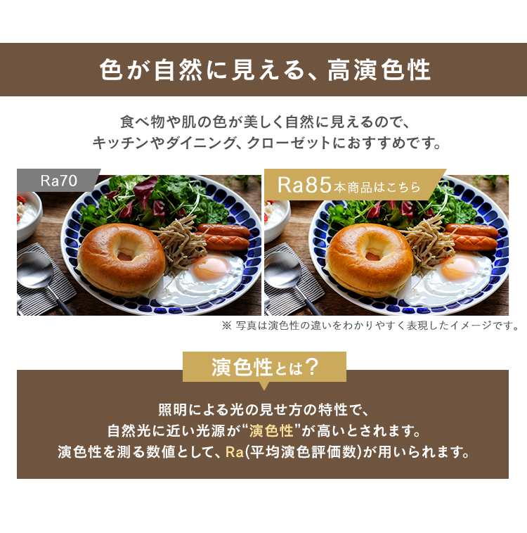 演色性が高いほど、肌や食べ物の色がより美しく自然に見えます。