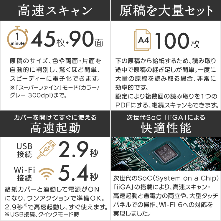 毎分45枚・90面の高速スキャンを実現。
