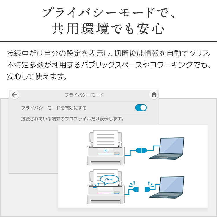 タッチパネルからユーザーを簡単に切り替えることができるので、自分の設定・アイコンを表示でき、共用利用でも迷わずスキャンが可能です。