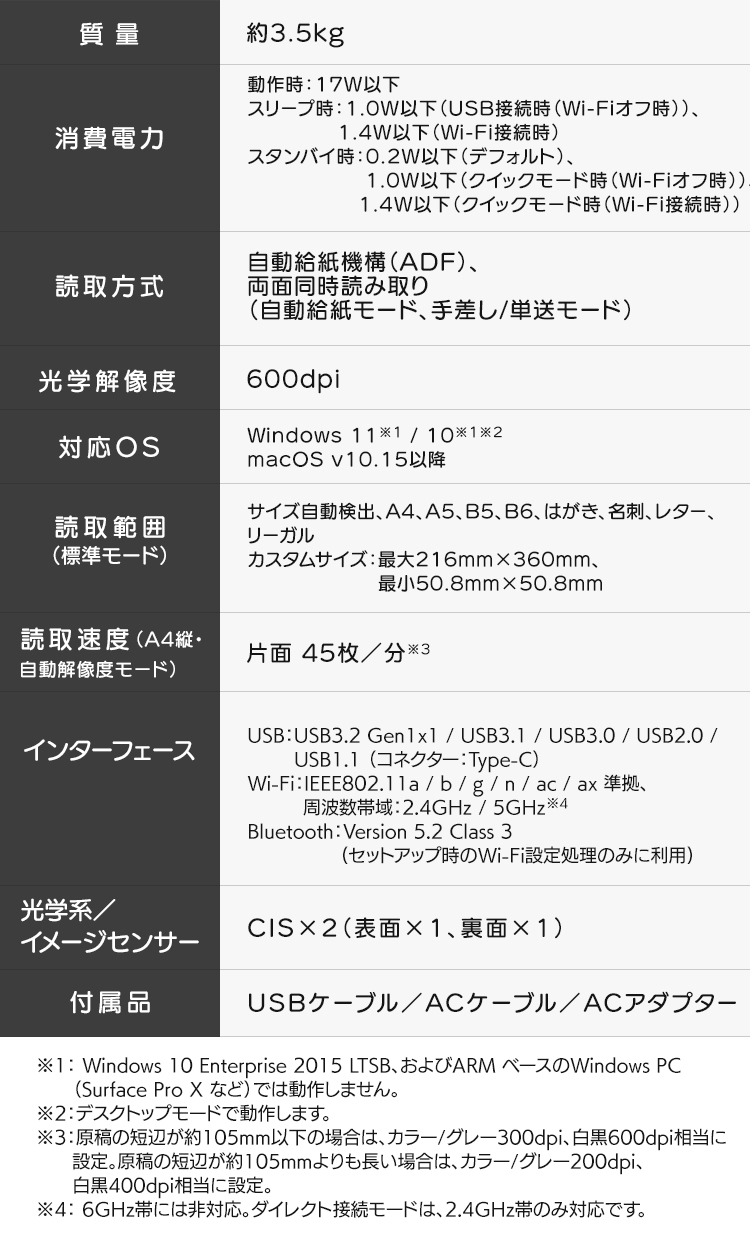 ■スリープ時:1.0W以下(USB接続時(Wi-Fiオフ時))、1.4W以下(Wi-Fi接続時)