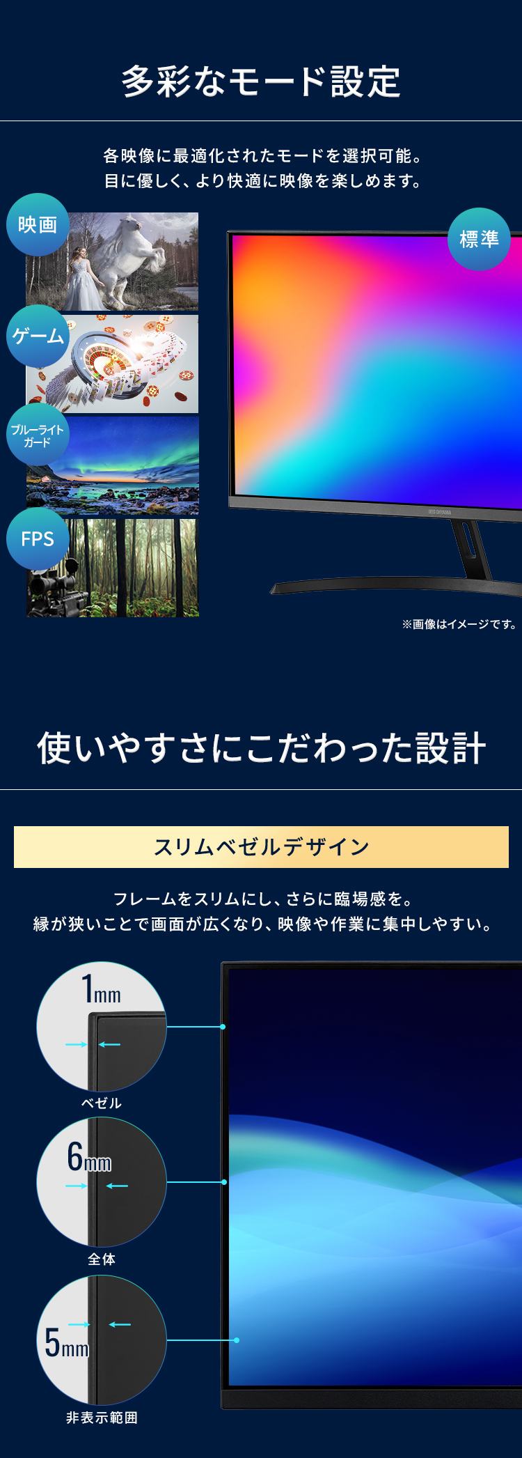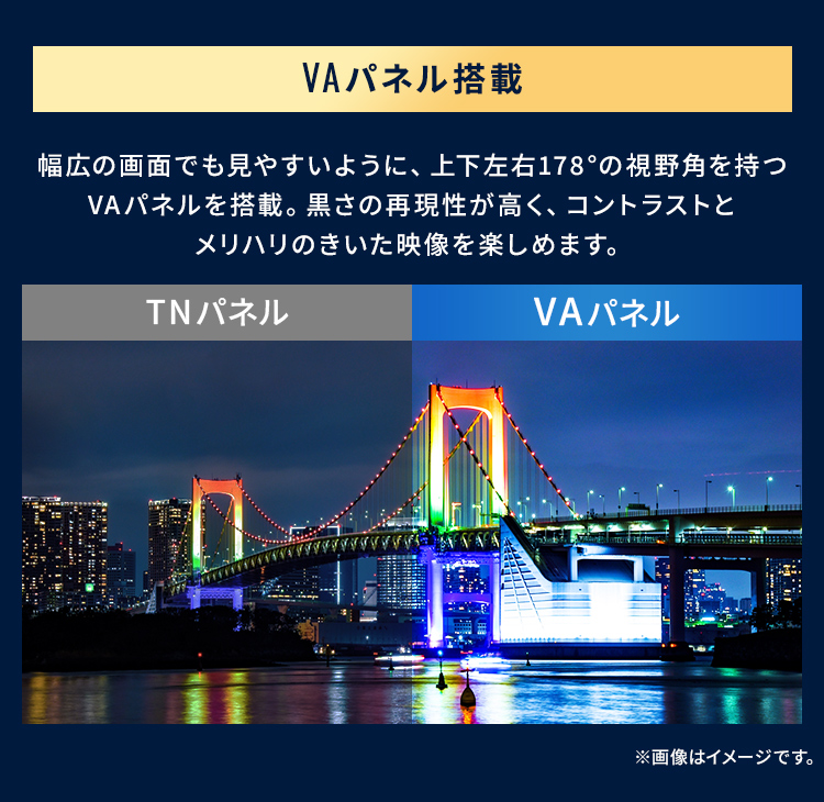 幅広の画面でも見やすいように、上下左右178°の視野角を持つVAパネルを搭載しています。