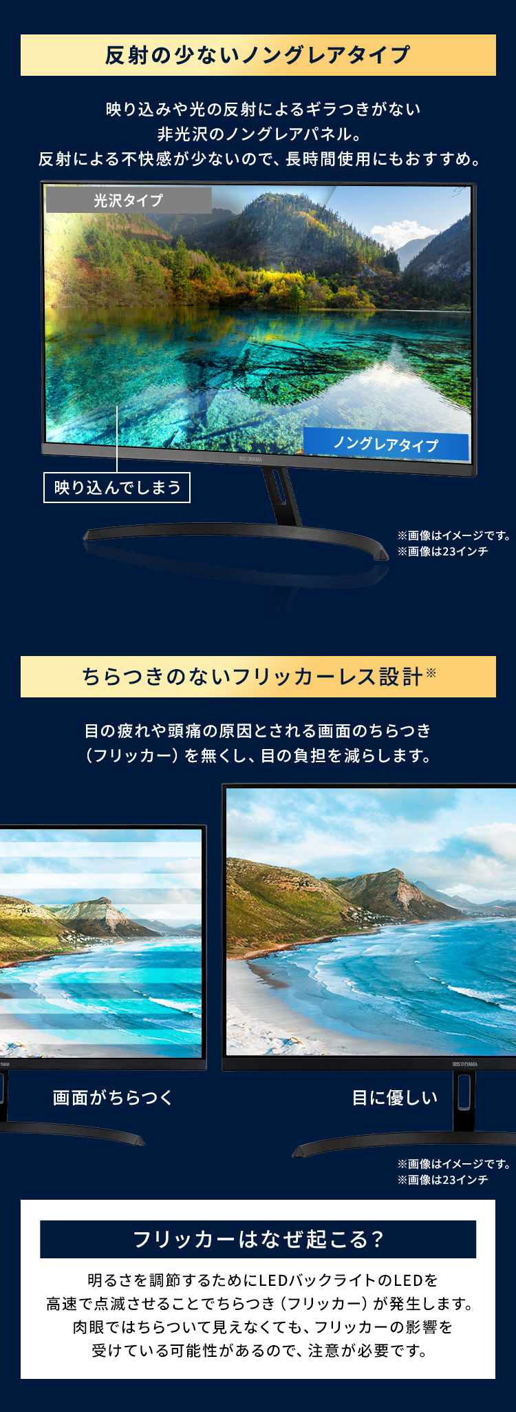 映り込みや光の反射によるギラつきがない、非光沢のノングレアタイプです。