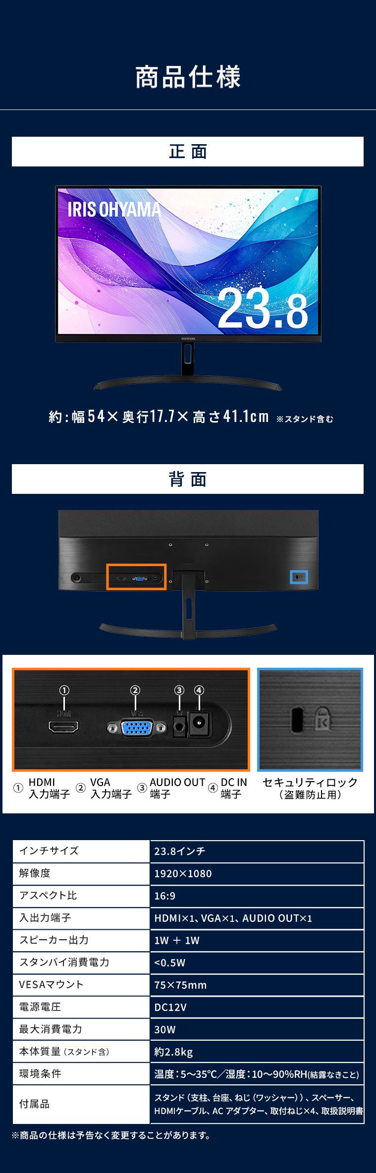 HDMIケーブル(約1.5m)、ACアダプター、スタンド用ネジ、簡易取扱説明書、スペーサー、取付ねじ×4(M4×20mm×2本、M4×10mm×2本)