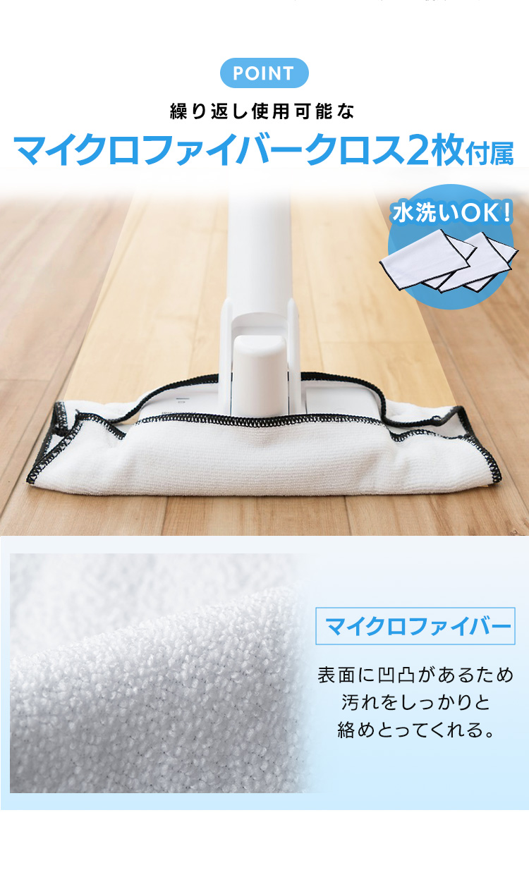 繰り返し使用可能なマイクロファイバークロス2枚付き。
