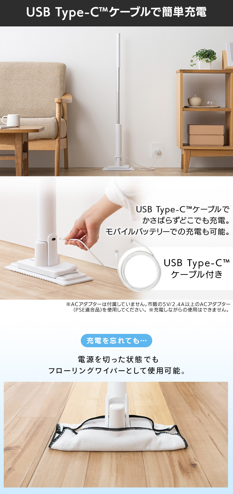 ※ACアダプターは付属していません。市販の5V2.4A以上のACアダプター(PSE適合品)をご使用ください。