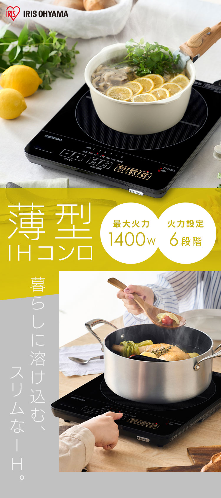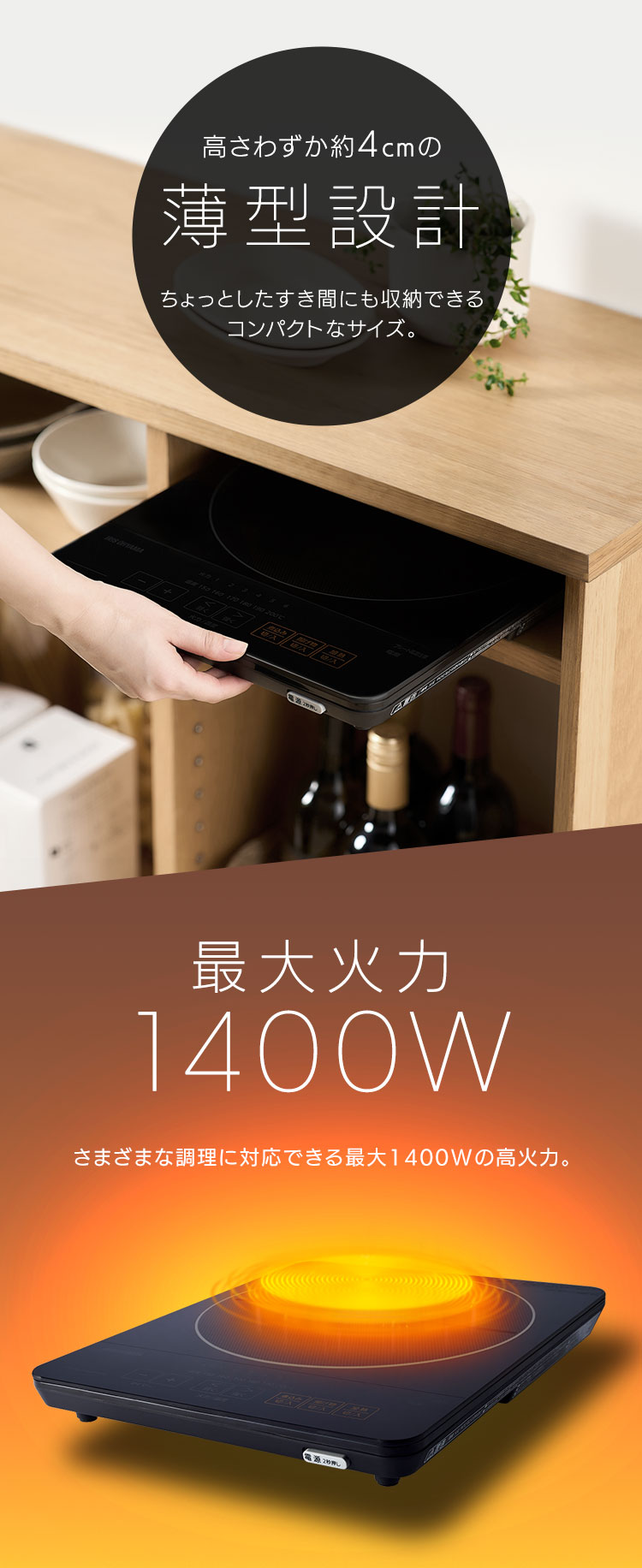 IHクッキングヒーター IHコンロ 薄型 卓上 1口 1400W スリム 省スペース 一口 焼肉 鍋 電磁調理器 工事不要 一人暮らし 一人用 IHC-T43-B アイリスオーヤマ