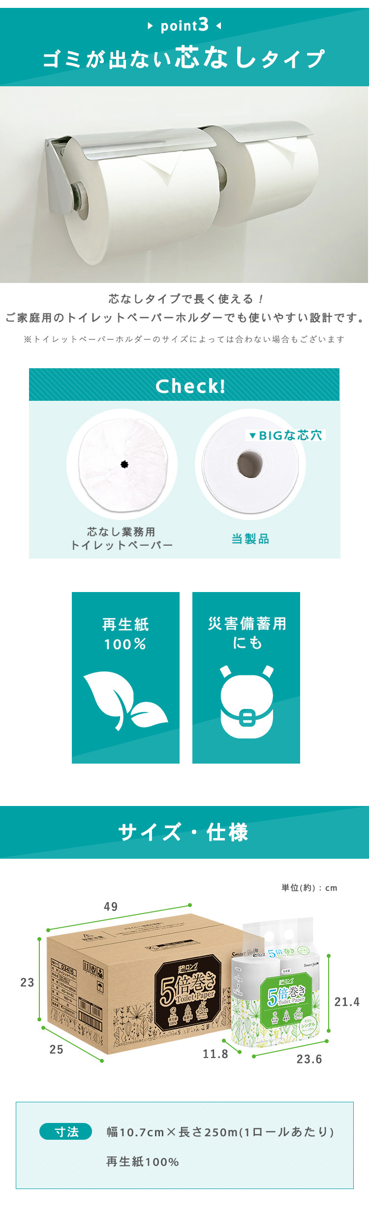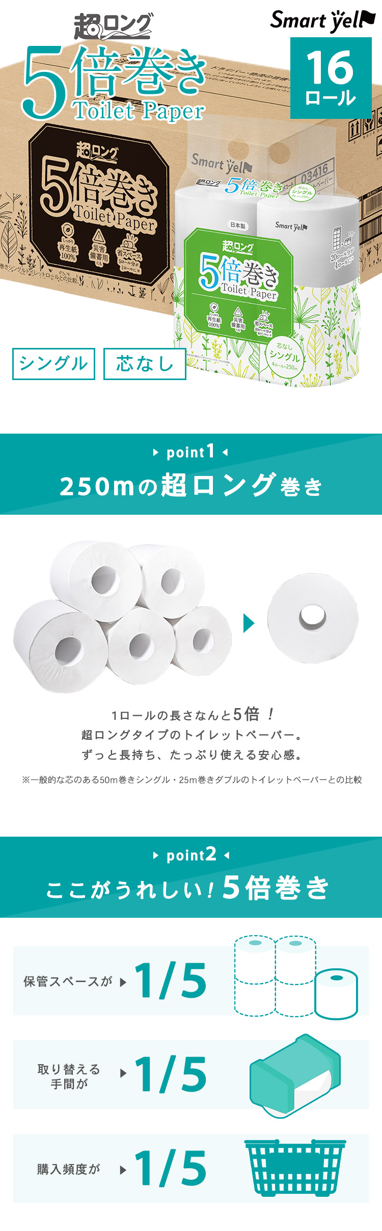 [検索用:トイレットペーパー シングル 省スペース トイレットロール 5倍巻き 芯なし 長持ち 再生紙 エコ 250m 16ロール スマートエール アイリスプラザ FSC認証 ロング 長尺]