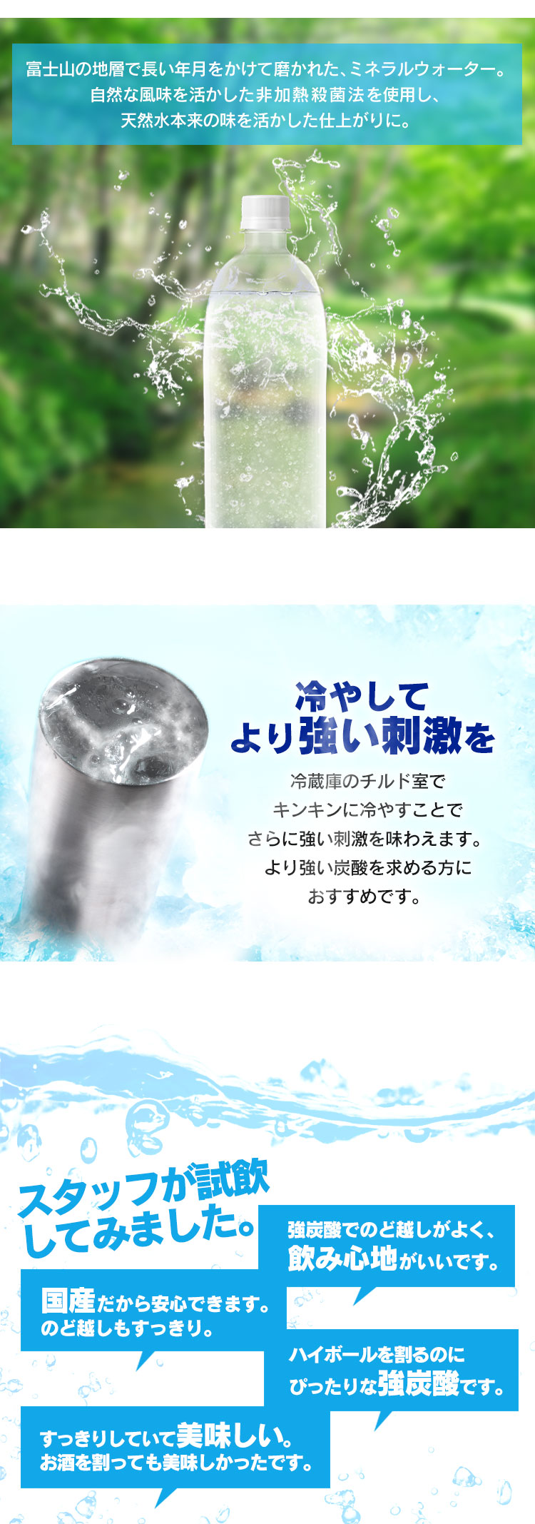 はじける刺激と富士山の天然水のうま味を感じるすっきり爽快感の後味。
