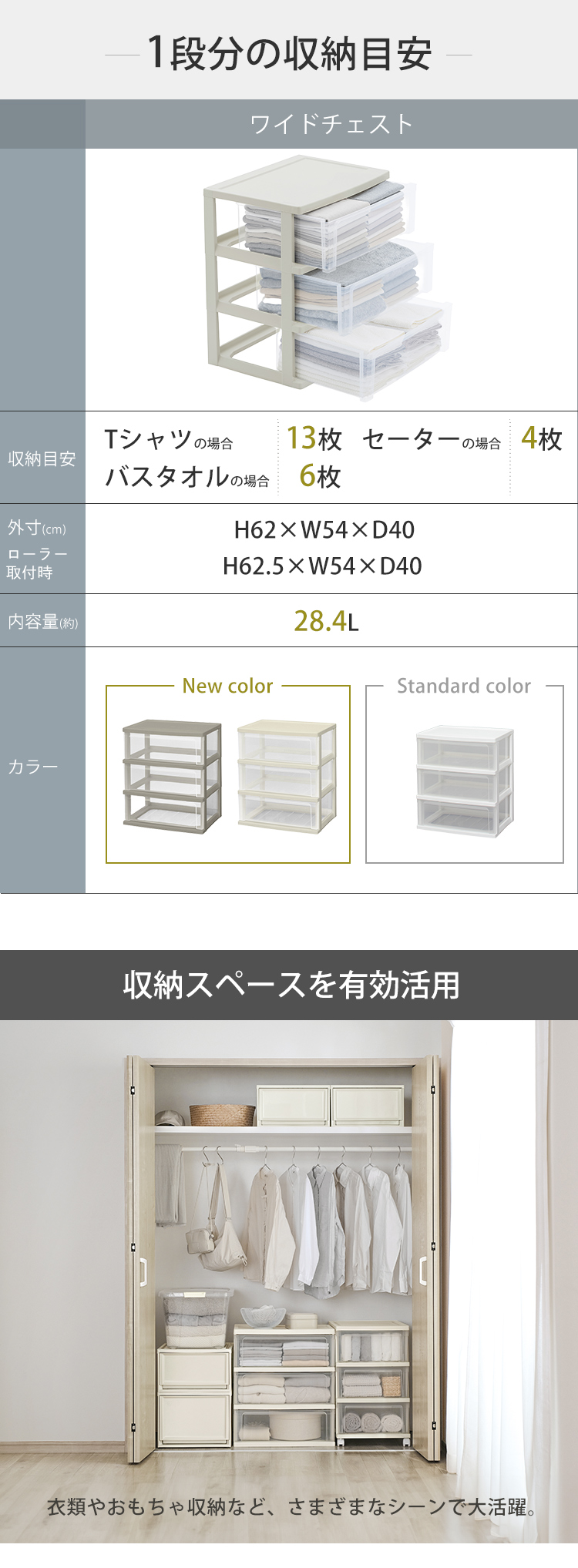 収納目安は“Tシャツ約13枚/セーター約4枚/バスタオル約6枚”。