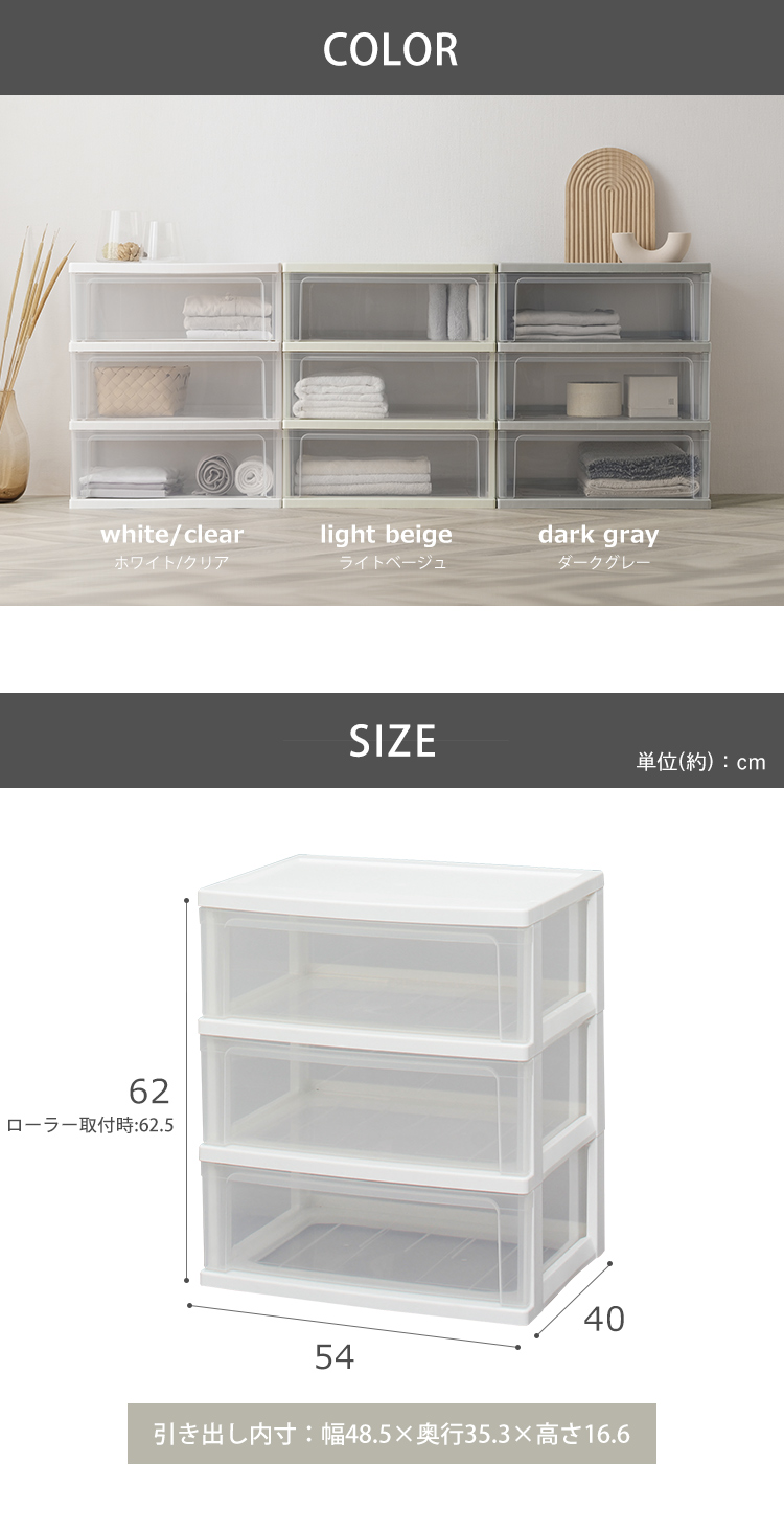 外寸:幅約54×奥行約40×高さ約62(ローラー取付時:高さ約62.5)