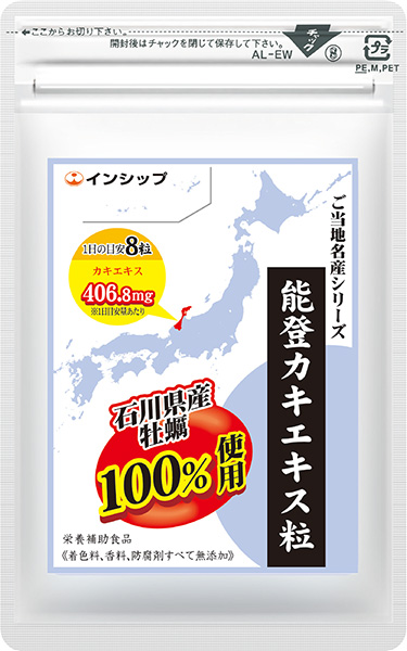 【主要成分/1日8粒で】 | カキエキス | 406.8mg | 商品名 | 能登カキエキス粒 | 名称 | 牡蠣加工食品 | 主原料採取地 | 日本 | 1袋内容量 | 30g(1粒約113mg×約260粒) | 1日の目安量 | 8粒 | 原材料名 | カキエキス、コーンスターチ、カキ肉末 | 広告文責 | 株式会社インシップ 047-390-9546 | メーカー | 株式会社インシップ | 区分 | 日本製・栄養補助食品 | 栄養成分表示/1日8粒(904mg)あたり | エネルギー | 3.489kcal | たんぱく質 | 0.238g | 脂質 | 0.043g | 炭水化物 | 0.536g | ナトリウム | 11.662mg(食塩相当量・・・0.03g) |  なぜ (Why) | 主目的 | お客様のために | 何を (What) | 主原料 | 牡蠣(カキエキス) | どこで (Where) | 主原料採取地 | 日本 | 誰が (Who) | 主原料メーカー | (株)かわばた | いつ (When) | 製造年月日 | 製造年月日・賞味期限を全商品で表示 | どのように (How) | 放射能検査 | 全商品毎ロット検査・厳しい自社基準 | |