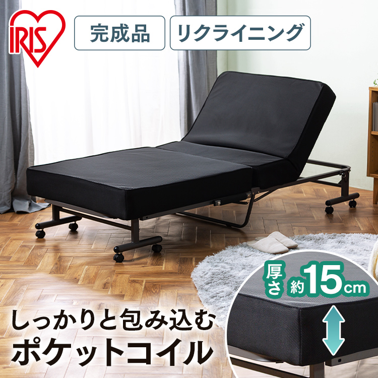 折りたたみベッド 組立不要 リクライニング ポケットコイル 手動 完成品 キャスター付き OTB-PSN ブラック アイリスオーヤマ 一人暮らし 新生活