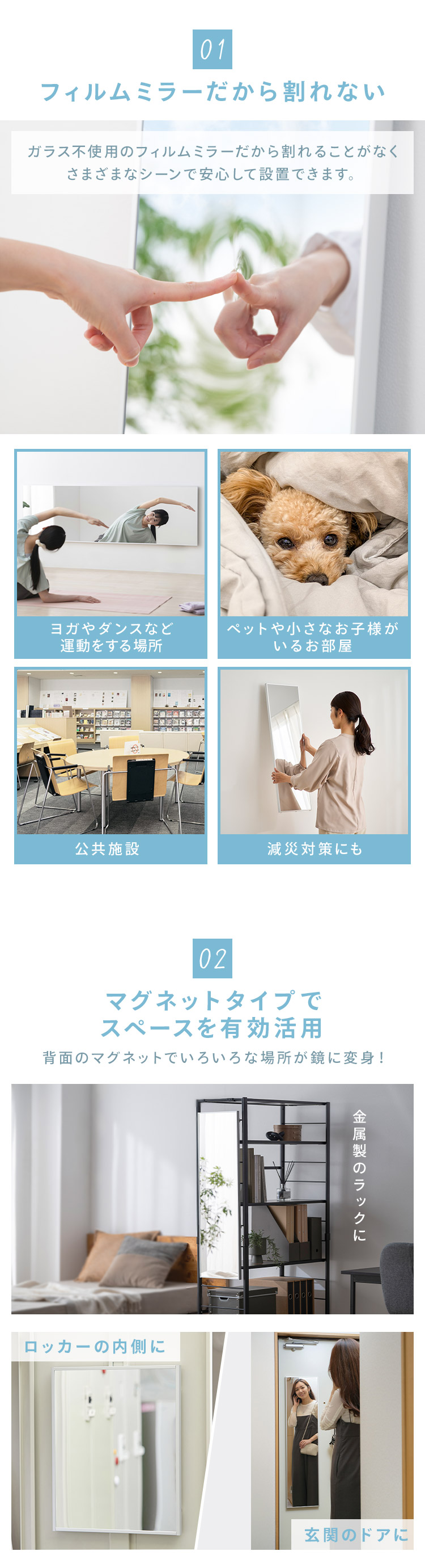 ガラス不使用のフィルムミラーだから割れることがなく、さまざまなシーンで安心して設置できる。