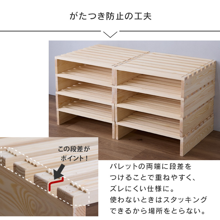 パレットの両端に段差をつけることで、重ねやすくズレにくい仕様です。