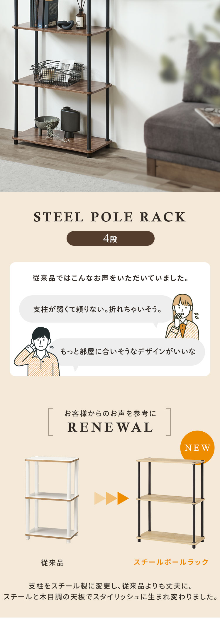 ポールはスチールのため、耐久性に優れ、組み立て時や使用時も安心してご使用いただけます。