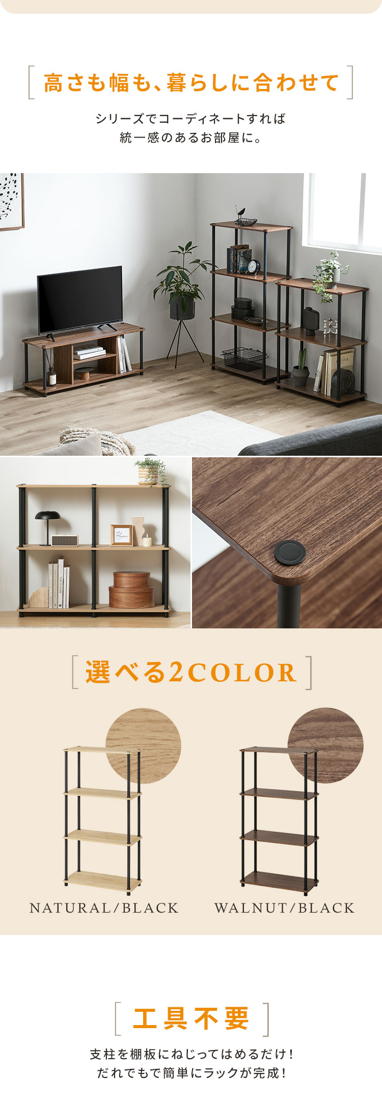 工具不要で、ポールをはめてねじるだけで簡単に組み立てることができます。
