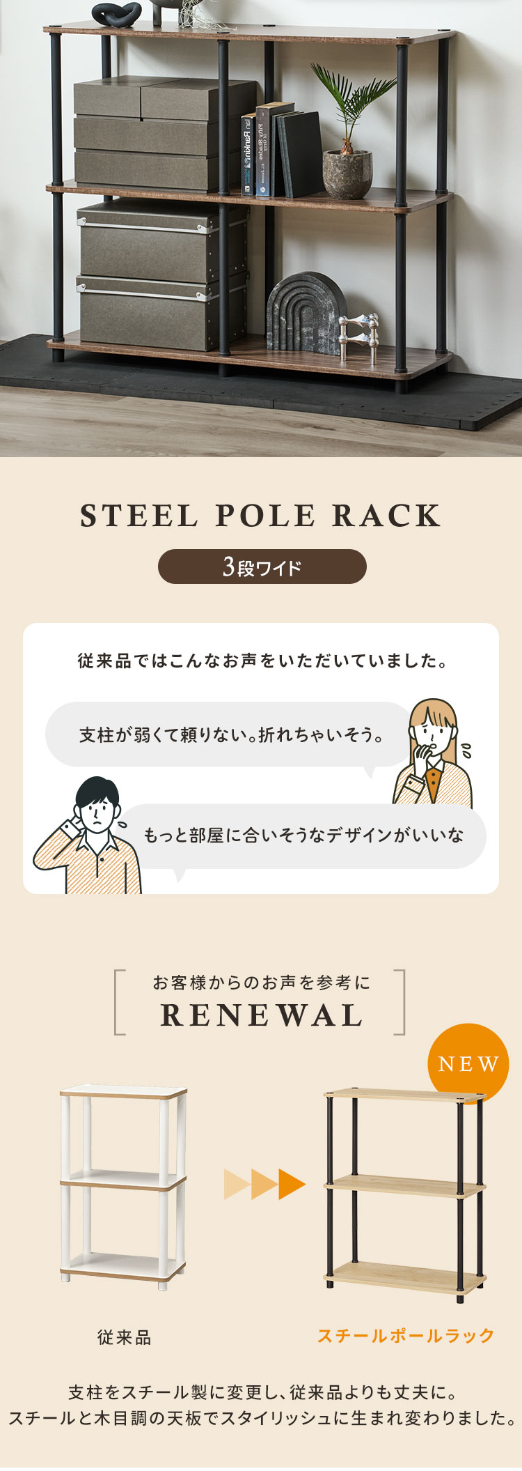 簡単に組み立てができるスチールポールラックです。