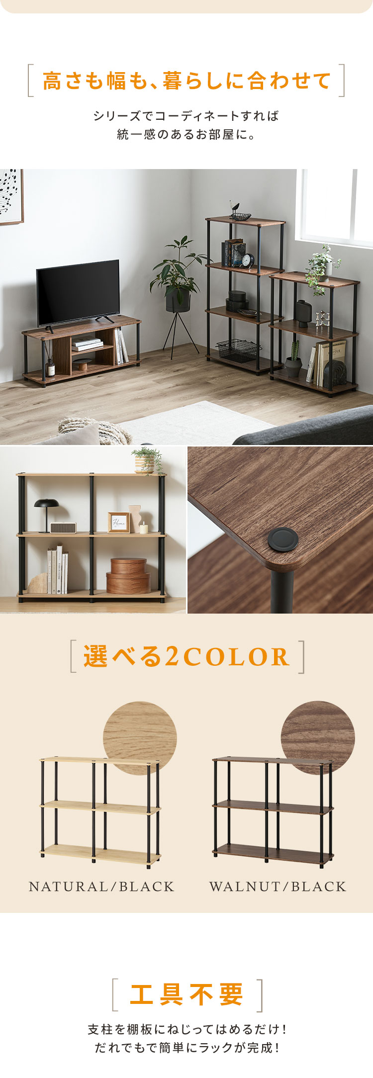 工具不要で、ポールをはめてねじるだけで簡単に組み立てることができます。