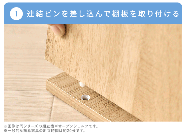 工具不要で、棚板とワイヤーを取り付けるだけで簡単に組み立てることができます。