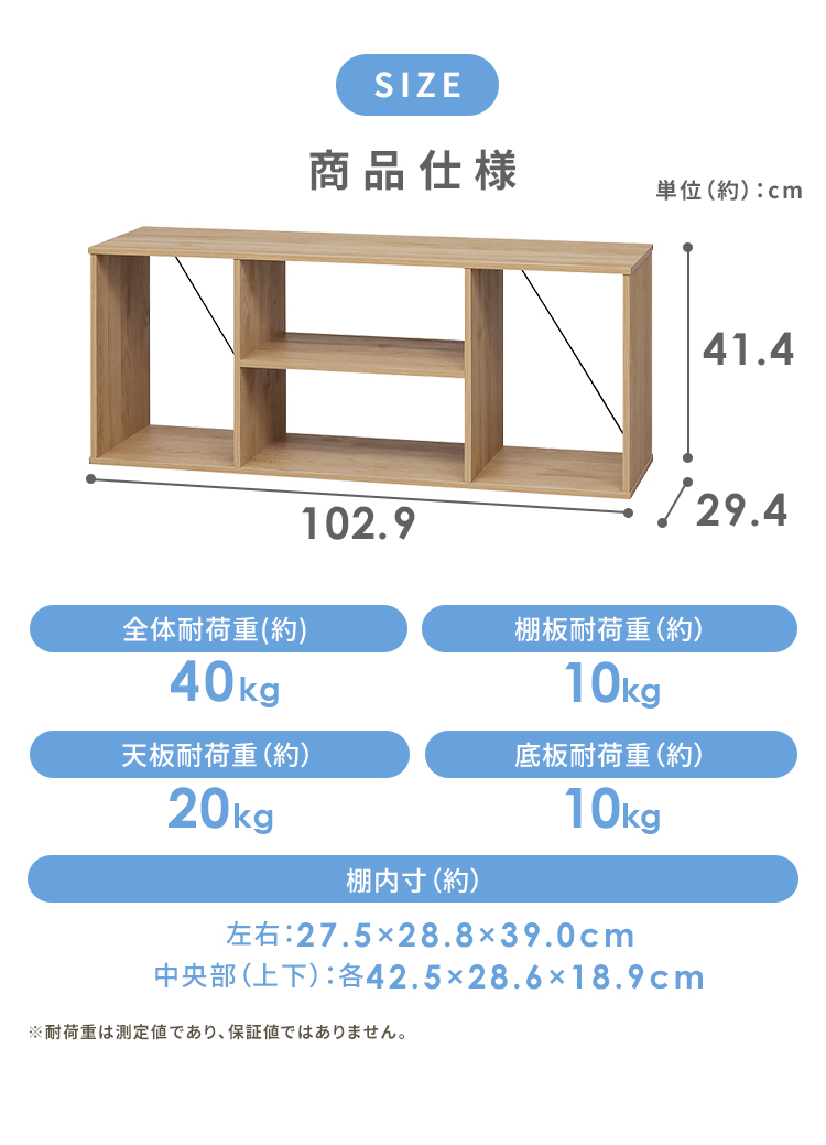 全体:約40kg、天板:約20kg、棚板:約10kg、底板:約10kg