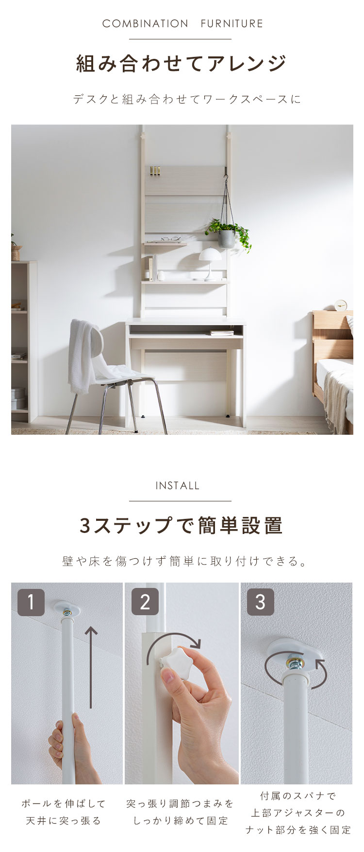 壁に穴を開けずに設置できるので賃貸でも安心。