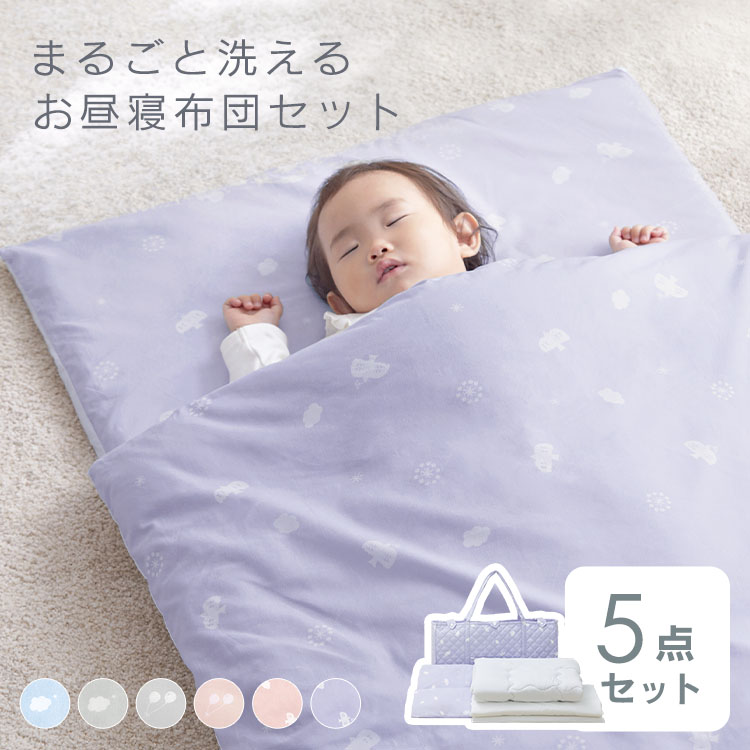 掛け布団・敷き布団・掛け布団カバー・敷き布団カバーに収納バッグが付いた、お昼寝布団5点セットです。