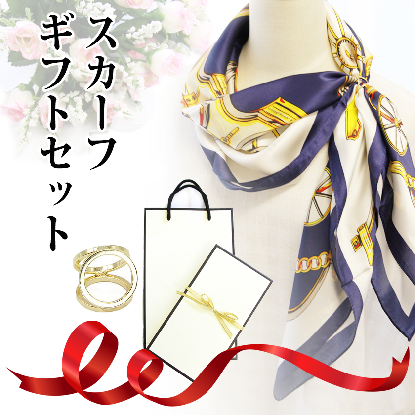 当店人気の88cm×88cmの大判シルクサテンスカーフ1点+スカーフ留め1点のセットです。