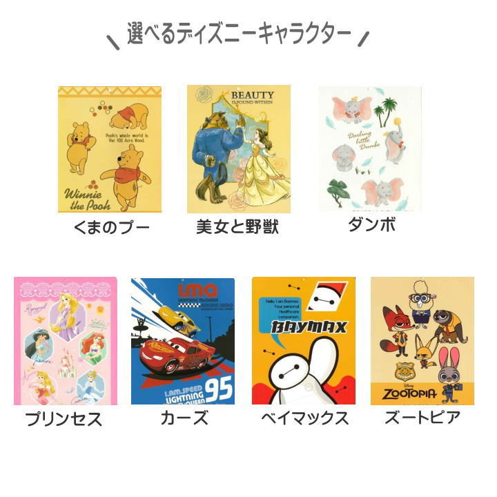 | ・くまのプー ・美女と野獣 ・ダンボ ・プリンセス ・カーズ ・ベイマックス ・ズートピア |