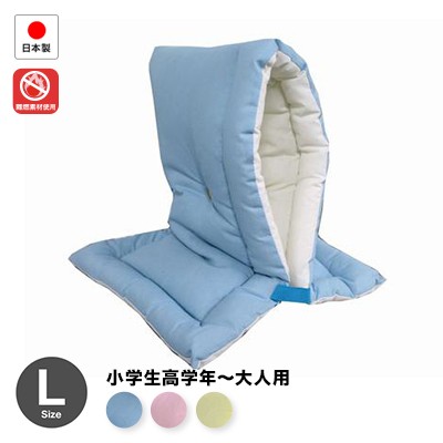 災害時に大事な頭を守ります。★ふだんはクッション座布団として使えます。学校のいすにも使えます。【地域によっては必須です】★ポリエステル綿で厚みがあります。★イス掛け用バンド付!頭巾と同色のゴム付きで、椅子からずれません。★ずきんの裏には緊急時に必要な情報を記載する名札付です。●サイズ:約46cm×30cm(Lサイズ)