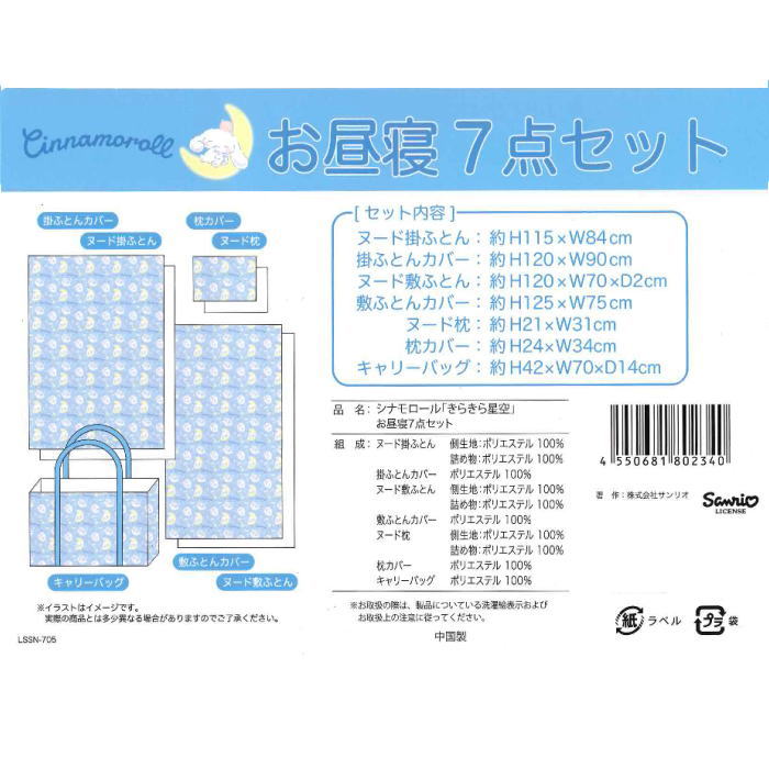 | ●サイズ(約): ヌード掛け布団:115×84cm 掛け布団カバー:120×90cm ヌード敷布団:120×70×2cm 敷布団カバー:125×75cm ヌード枕:21×31cm 枕カバー:24×34cm キャリーバッグ:42×70×14cm |