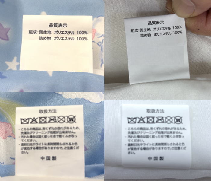 | ・ふとん:ファスナー開閉 ・枕カバー:合わせ仕様 ・バッグ:ひも開閉 |