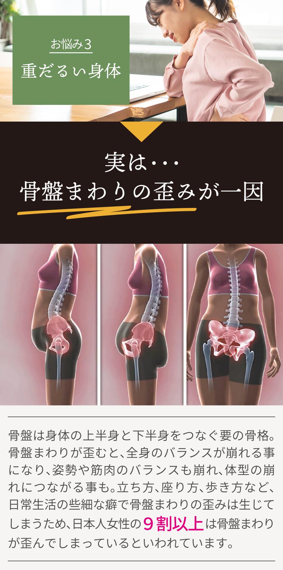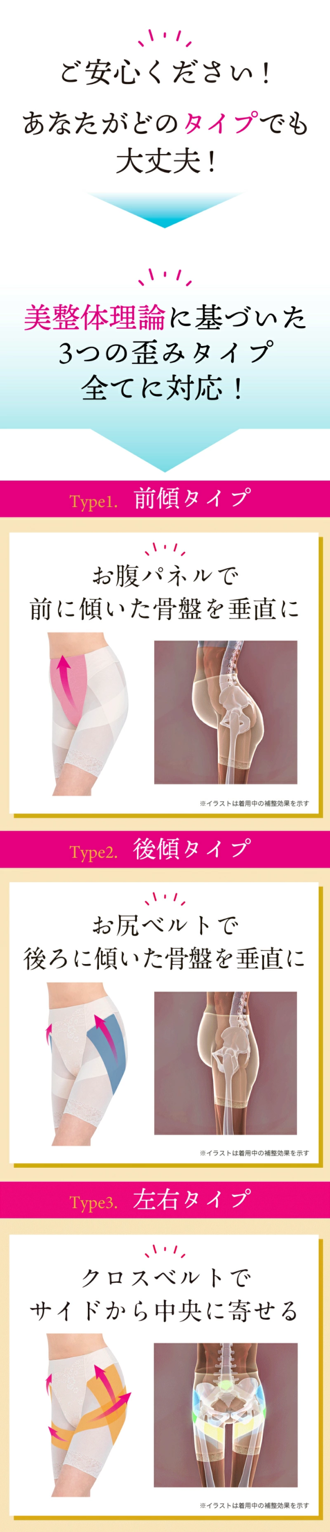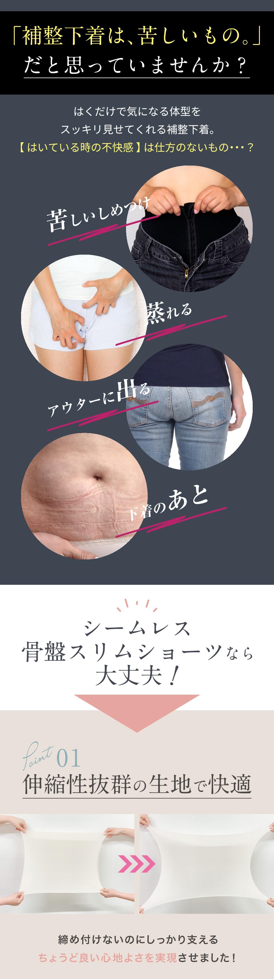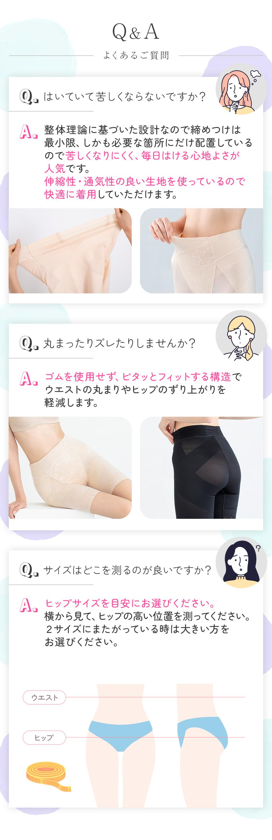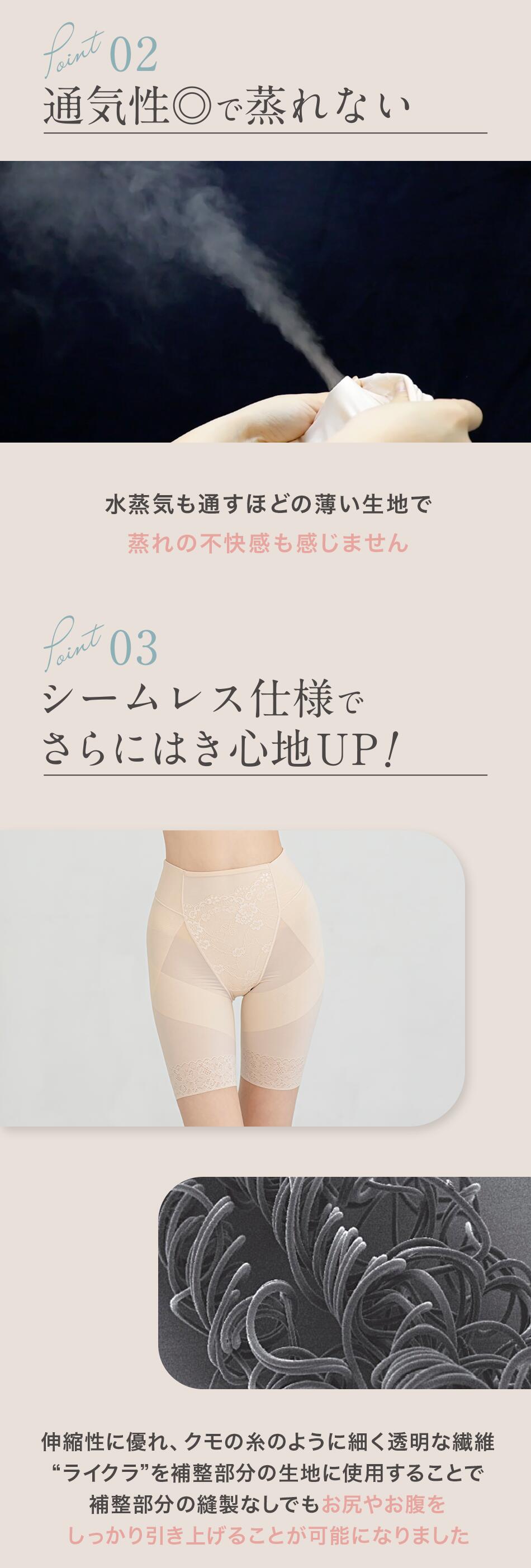 素材の違う3つの補整パーツで骨盤を正しい位置に導きながら肉感を抑え、きれいな補正を実現。さらに、補整生地をシームレス仕様にすることではいていることを忘れるようななきごこちに。