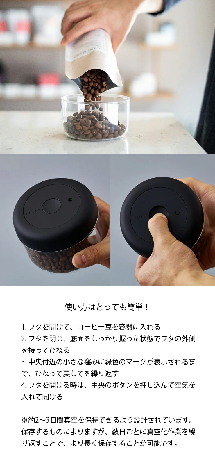 | 注意事項 | ・細かい粒子状やパウダー状のもの(茶葉や、挽き豆)、液体状のものには使用しないで下さい。空気を抜く過程で、それらが目詰まりを起こす可能性があります。 ・食洗機、電子レンジ、オーブン、冷凍庫は使用できません。 ・焙煎したてのコーヒー豆を保存する場合などは、放出されるガスによって内圧が変化し、緑色のサインが戻る場合があります。その際には数日おきに、蓋を捻ることで効果が持続します。 |