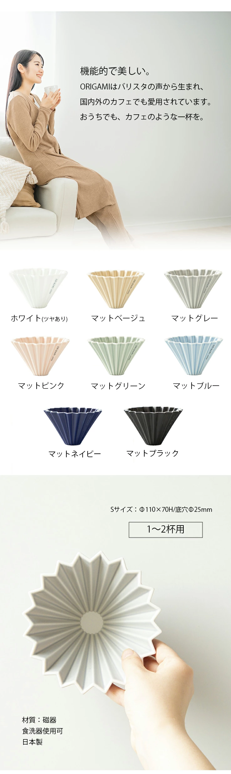 1〜2杯用の陶器のドリッパーSサイズです。カラーリングと縦溝がまるでオリガミを折ったようにみえるORIGAMIのドリッパーです。20あるリブ(溝)がドリッパーとペーパーの間に空間を作ることでお湯の抜けをスムーズにし、多彩な抽出を表現。速度コントールも自由自在です。カラフルなカラーリングからお選びいただけます。ツヤのあるシンプルなホワイト、やさしいお色のマットカラー5色からお選びいただけます。