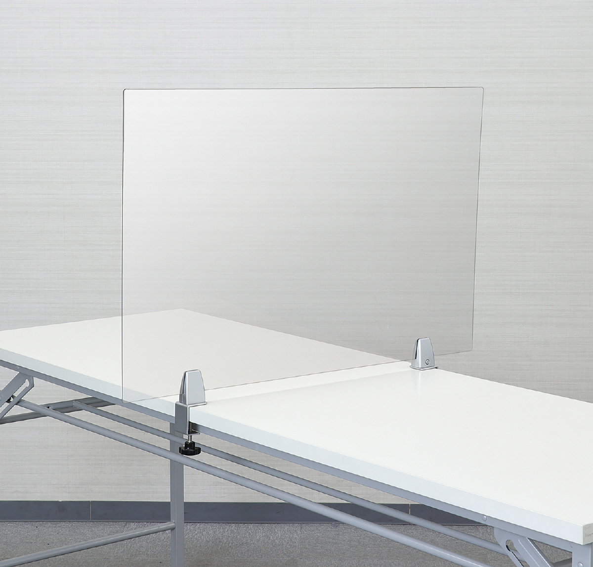 オフィスや飲食店のカウンターテーブルに最適な机に固定できるクランプとパネルパーテーションのセット