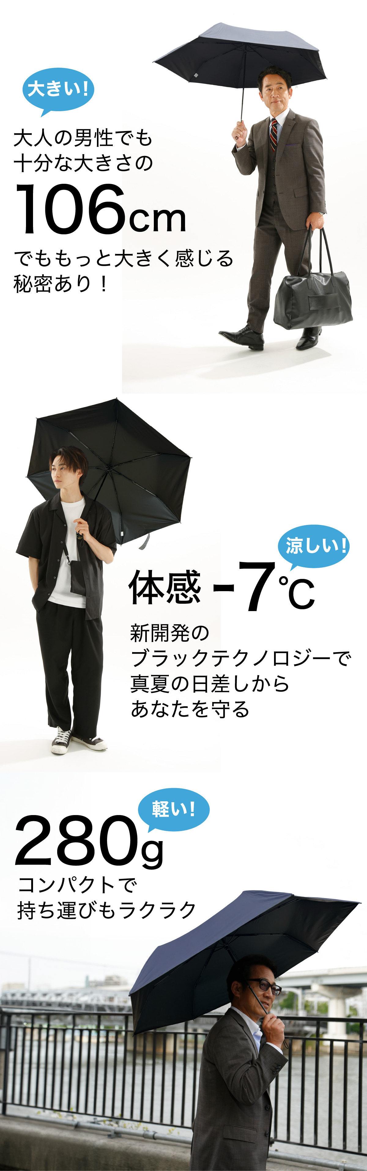 大きくて軽い、メンズにぴったりの晴雨兼用傘。灼熱の太陽やゲリラ豪雨から、あなたを護る!