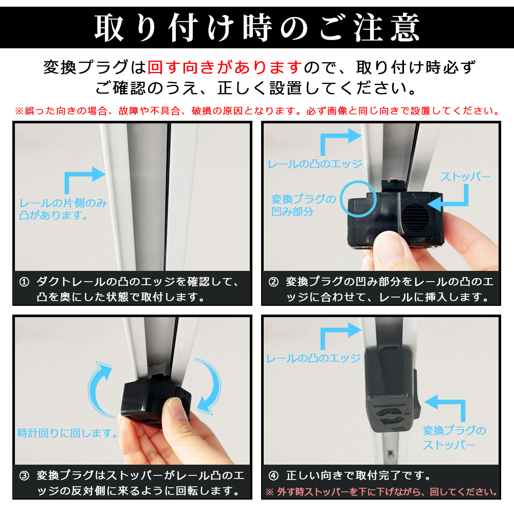 ■ ダクトレールに取り付けの際、設置方向にご注意ください。誤った方向の場合、故障や不具合、破損、変換プラグが外れにくくなる原因となります。