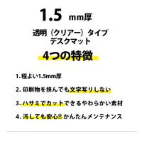 マットの厚さは1.5mm厚。サイズは約450×900mm。 程よい厚みでデスクやーブルデスクの天板を傷、汚れから保護します。 透明クリアータイプなので天板の美しさをそのまま表現。 非転写剤が配合された素材を使用。両面ともにインク写り(浸透)を防ぐ効果があります。 柔らかい素材なのでハサミなどでもカットでき、使用しないときは丸めて収納できます。 |