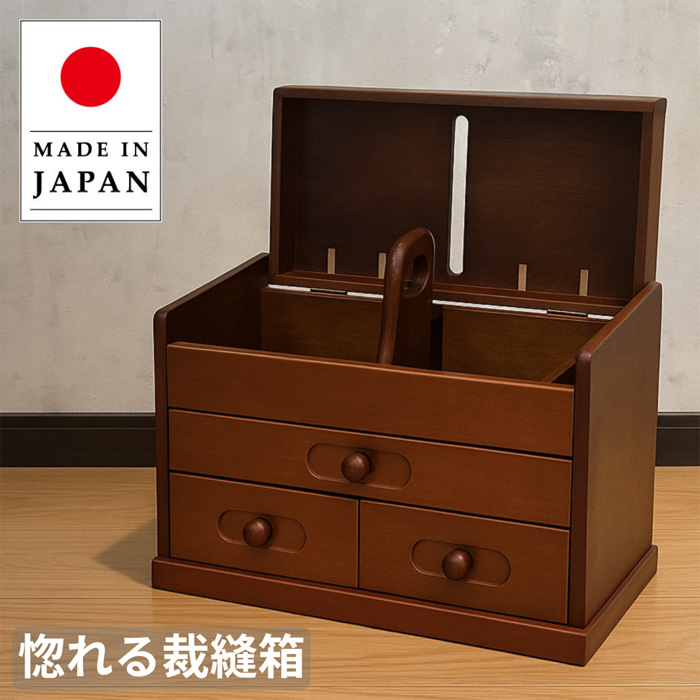 贈り物としても大変喜ばれるソーイングボックス!【サイズ】■本体:W330×D185×H240(取手まで285)mm■小引出し:約W142×D145×H61mm■大引出し:約W298×D143×H38mm【備考】■カラー:茶■生産国:日本■構造:完成品【納期】■ご注文後、約1週間程でお届け致します。(※在庫切れの際は納期にお時間が掛かる場合がございます。)【用途】ソーイング,ソーイングボックス,ソーイングBOX,裁縫箱,針箱,ハリ箱,裁縫道具入れ,裁縫用具入れ,母の日,敬老の日,高級,贈り物,国産,日本製,送料無料,通販,セール,SALE,MK5113茶