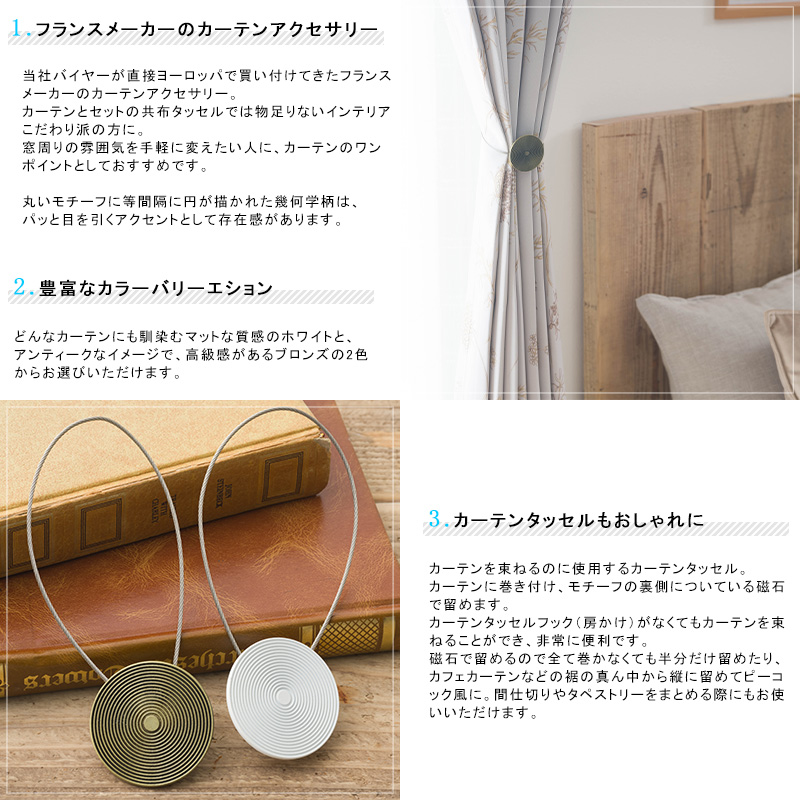 | 当社バイヤーが直接ヨーロッパで買い付けてきたフランスメーカーのカーテンアクセサリー。 カーテンとセットの共布タッセルでは物足りないインテリアこだわり派の方に。 窓周りの雰囲気を手軽に変えたい人に、カーテンのワンポイントとしておすすめです。 丸いモチーフに等間隔に円が描かれた幾何学柄は、パッと目を引くアクセントとして存在感があります。 どんなカーテンにも馴染むマットな質感のホワイトと、アンティークなイメージで、高級感があるブロンズの2色からお選びいただけます。 |