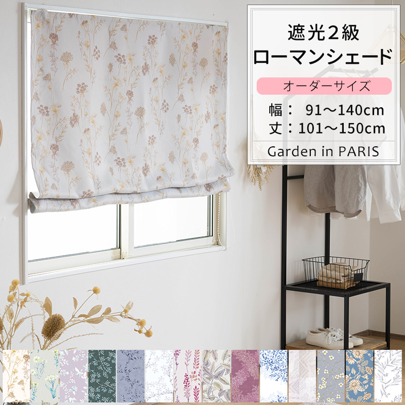 ローマンシェード サイズオーダー I型 幅91〜140cm 丈101〜150cm Garden in PARIS [1枚] 遮光2級 花柄 リーフ 北欧 OKC5 爆買