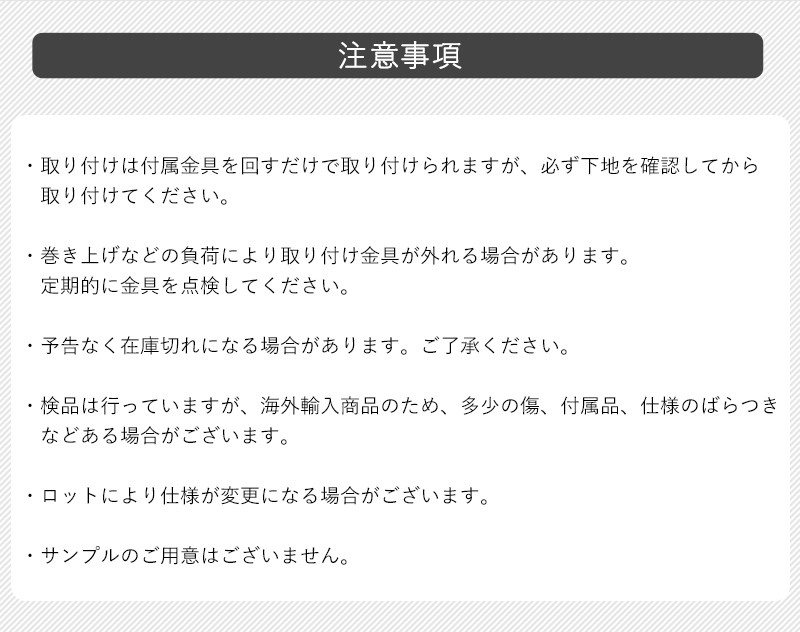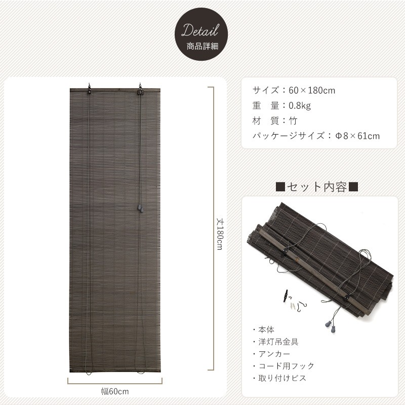 | ■商品名 フレンチバンブーブラインド S ■サイズ 60×180cm ■重量 0.8kg ■材質 竹 ■付属品 洋灯吊金具、アンカー、コード用フック、取り付けビス ■パッケージサイズ Φ8×61cm ■メーカー フランス ■備考 本体についている三角吊カンは2個 ■取り付け方 本体:付属の取り付け用金具、もしくは別売りのすだれ掛けを本体についている三角吊カンの幅に合わせて取り付け個所に設置し、引っ掛けます。 コード用フック:付属のコード用フックを手が届きやすい位置に付属ビスでとりつけます。プラスドライバーが必要です。 ■使い方 コードは下に引けば本体を巻上げ、右に引けば任意の長さで留めることができます。 巻き上げるとコードが長くなるので、付属のコード用フックを取り付け、巻き上げの際はコードをフックに引っ掛けて収納することをお勧めします。 ■商品についての注意事項 ・取り付けは付属金具を回すだけで取り付けられますが、必ず下地を確認してから取り付けてください。 ・巻き上げなどの負荷により取り付け金具が外れる場合があります。定期的に金具を点検してください。 ・予告なく在庫切れになる場合があります。ご了承ください。 ・検品は行っていますが、海外輸入商品のため、多少の傷、付属品、仕様のばらつきなどある場合がございます。 ・ロットにより仕様が変更になる場合がございます。 ・サンプルのご用意はございません。 |