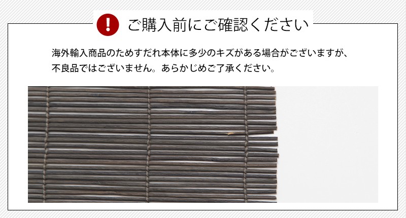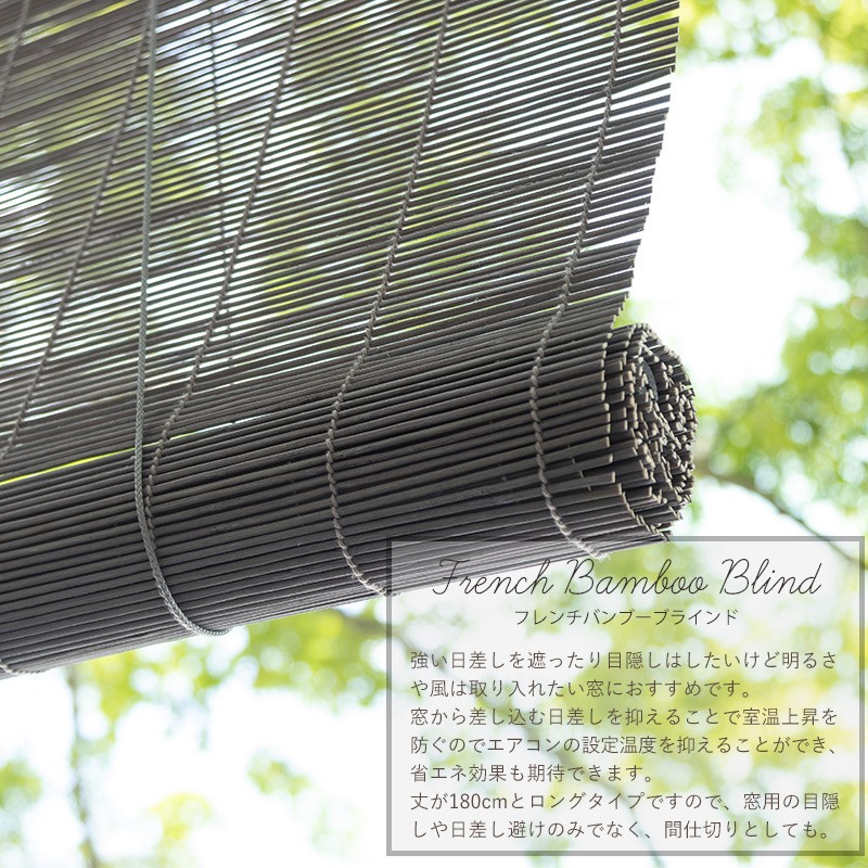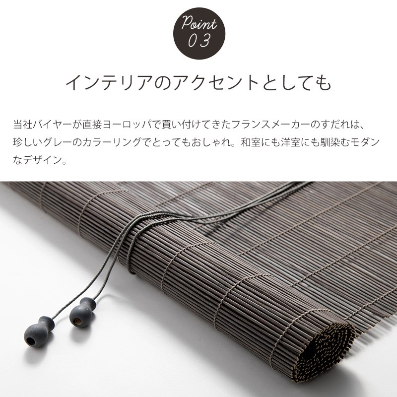 | 強い日差しを遮ったり目隠しはしたいけど明るさや風は取り入れたい窓におすすめの簾。 自然な風合いの竹製で、安価ながら巻き上げ用のコード付きでとても使いやすく、窓の外でも室内でもどちらでもお使いいただけます。 当社バイヤーが直接ヨーロッパで買い付けてきたフランスメーカーのすだれは、珍しいグレーのカラーリングでとってもおしゃれ。 サイズはSサイズ幅60cm、Lが幅120cmの2サイズご用意。丈はどちらも180cmあるのでベランダや和室の掃き出し窓にも、巻き上げたまま留めることができるので、小窓や腰窓にも使えます。 |