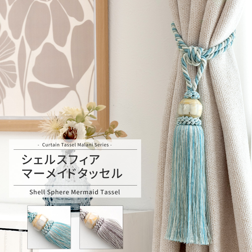 | 色やシェルの部分など指定した当社オリジナルカラー! 細めのツイストのホルダーに、インテリアのポイントになる大きなシングルタッセル。 海をイメージして濃淡の異なる同系色の糸を3色組み合わせました。 ブルーミックスはターコイズブルー、パープルミックスはくすみラベンダーのカラーがポイント。 貝殻細工のシェルタッセルキャップもキラキラと可愛くおしゃれ。 グラデーションカラーのカーテンや刺繍やジャガード織りなど高級感のある生地におすすめ。 厚地カーテンには共布の舟形タッセルが付属していますが、タッセルにこだわるとインテリアにぐっとこなれ感が出ておしゃれになります。 →カーテンアクセサリーの一覧はこちらをクリック |