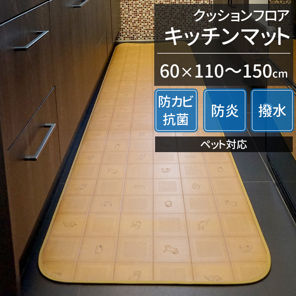 抗菌・防カビ機能で清潔さを保ち、はっ水加工でお手入れも簡単なクッションフロアキッチンマット。