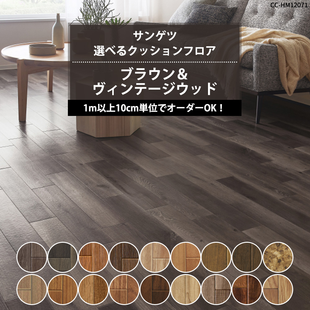| ■商品名:クッションフロアシート セレクション ブラウン&ヴィンテージウッド ■サイズ 幅182cm×長さ1m以上(10cm単位) ■1巻の最長サイズ 20m/巻 ■機能性 さらっと仕上げ/抗菌/耐次亜塩素酸 ■素材 表面:塩化ビニール 裏:ビニールまたは不織布 ■生産国 日本 |