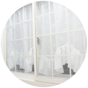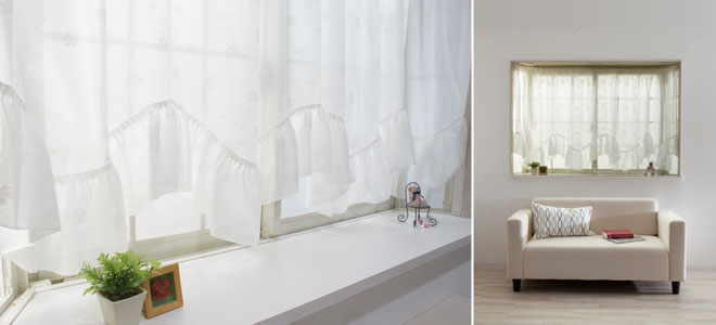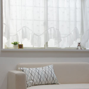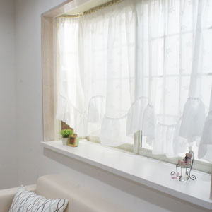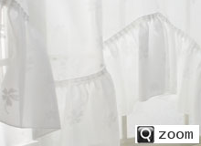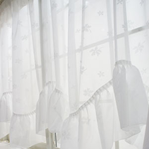 レースと同じチェルシー生地で仕上げたフリルが華やかでかわいい雰囲気に。 閉めっぱなしのレースカーテンでも、こんなスタイルレースならおしゃれなインテリアに早変わり!